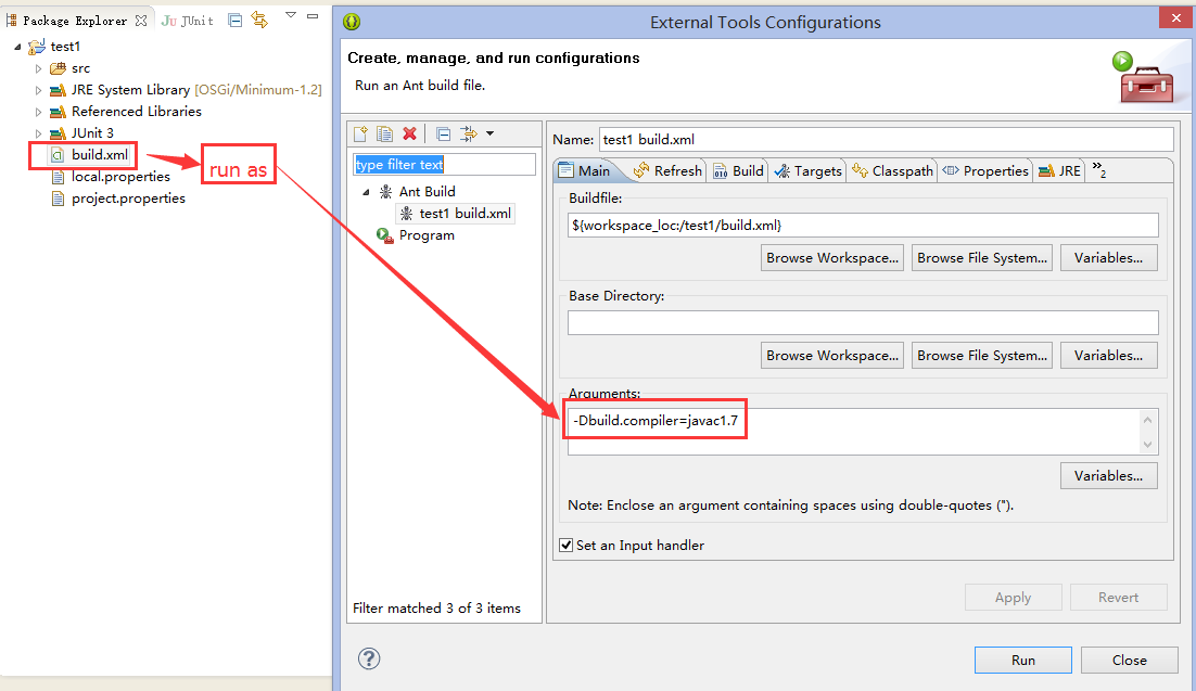 在main Tab 下輸入Argumens: -Dbuild.compiler=javac1.7——》