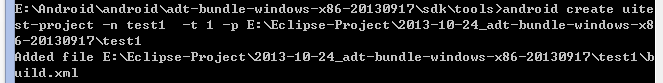 創建build.xml到測試工程中去,用於生成.jar文件:>Android create UItest-project –n testprojectname –t 1 –p testprojectpath