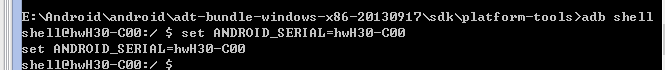 有多個設備連接開發機器時(模擬器或真機),通過設置ANDROID_SERIAL環境變量指定需要截圖的設備。比如下圖的:shell@hwH30-C00:/$ set ANDROID_SERIAL= hwH30-C00,設置連接成功後,返回:“set ANDROID_SERIAL=hwH30-C00”