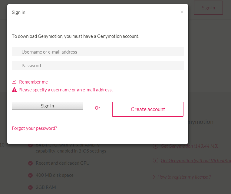 曾經嘗試在VM虛擬機內的Ubuntu系統裡面再運行Genymotion的,主要原因是要FQ去下載一些東西,又不想完全連到vpn上,不過最後的結果是雙重夢境失敗,具體原因不是很清楚,提示是不能虛擬化(也許是技術有限)。 遂換了一套Windows版的Genymotion,此處應FQ,或者去找其他人下好的,因為下載的時候需要登錄,是的需要登錄!!!這個設定太友好了,後面去下各個版本虛擬文件的時候還需要你登錄,而你不用VPN壓根登錄不上,不用VPN壓根不能下載,所以這個設定對於天朝人民來說真的是相當友好到了極點。 這裡是官方下載鏈接:下載鏈接