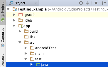 然後,在工程的src文件夾內創建test和test/java文件夾。需要注意的是,你不能在Android視圖下進行這些操作,要麼在系統的文件管理器內創建,要麼在工程窗口左上方點擊下拉菜單選擇Project視圖。最終的工程結構應該是這樣的: