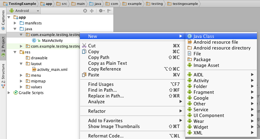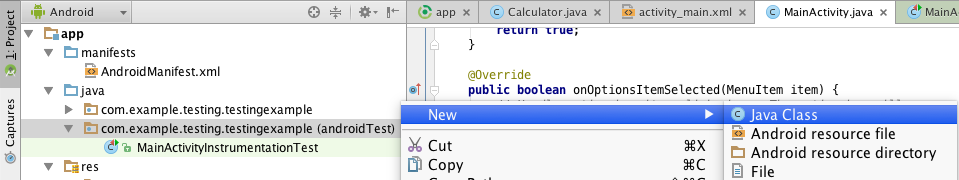 Android Studio提供了一個快速創建測試類的方法。只需在編輯器內右鍵點擊Calculator類的聲明,選擇Go to > Test,然後"Create a new test…"