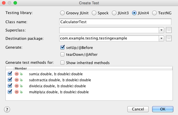 在打開的對話窗口中,選擇JUnit4和"setUp/@Before",同時為所有的計算器運算生成測試方法。
