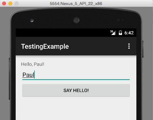在使用Espresso進行UI測試前,讓我們為app添加一些Views和簡單的交互。我們使用一個用戶可以輸入名字的EditText,歡迎用戶的Button和用於輸出的TextView。打開res/layout/activity_main.xml,粘貼如下代碼: