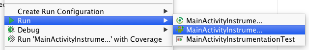 在工程的整體視圖上,找到以(androidTest)後綴結尾的包名並創建一個新的Java類。可以將它命名為MainActivityInstrumentationTest,將如下代碼粘貼過去。