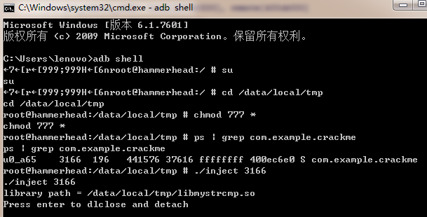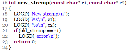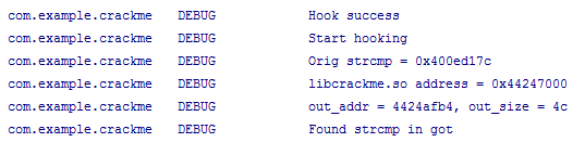 表明注入成功了,並且找到了strcmp函數,完整的意思就是已經把我們的libstrcmp.so注入到進程com.example.crackme裡了。並且把我們自己新寫的strcmp函數的地址替換掉了系統的strcmp函數地址,請看關鍵代碼: