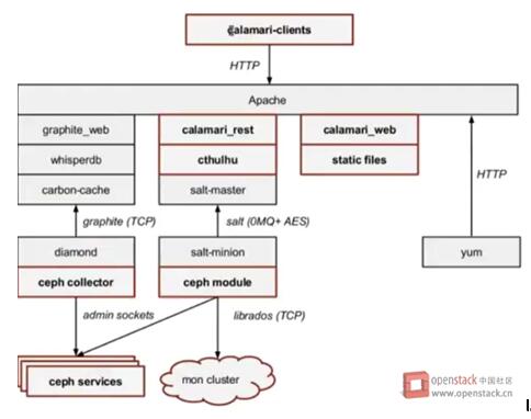 Calamari 使用了Saltstack讓Calamari Server和Ceph server node通信。Saltstack是一個開源的自動化運維管理工具,與Chef和Puppet功能類似。Salt-master發送指令給指定的Salt-minion來完成對Cpeh Cluster的管理工作;Salt-minion 在Ceph server node安裝後都會從master同步並安裝一個ceph.py文件,裡面包含Ceph操作的API,它會調用librados或命令行來最終和Ceph Cluster通信。