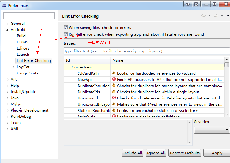 點擊android下面的lint error checking ->勾選掉run full error ....如下圖