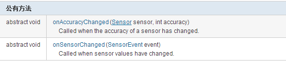 SensorEventListener:用於監聽傳感器,當傳感器的精度或者數據發生變化時,會回調裡面的對應方法。