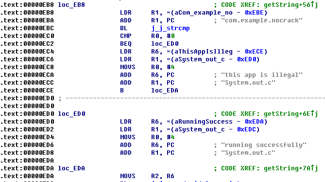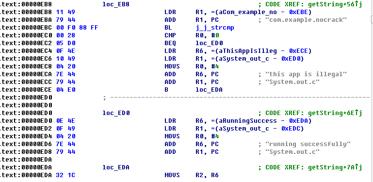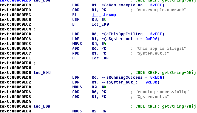把so拖入IDA直接定位到關鍵代碼處,BEQ意思是上一行的CMP比較指令如果R0等於0就跳轉到loc_ED0處,也就是成功運行處。但實際程序運行後R0的值不等於0.