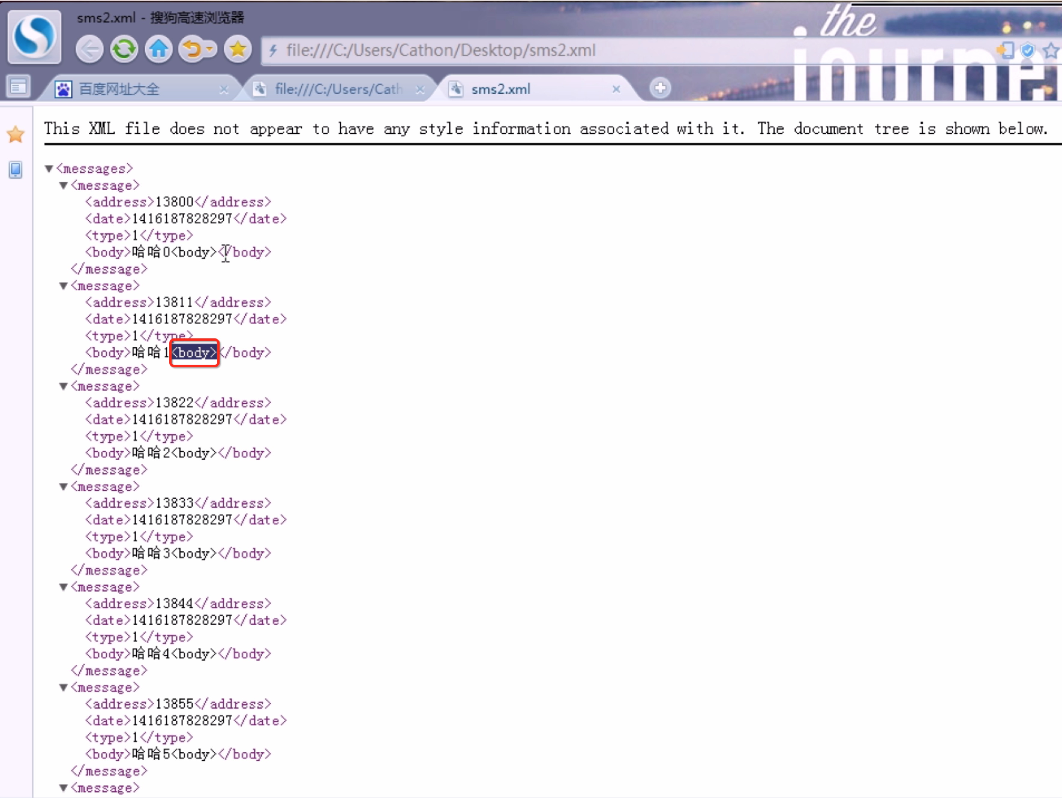 下面我們有這樣一個小案例:就是短信備份。我們先分析一條短信的結構(如下圖)。