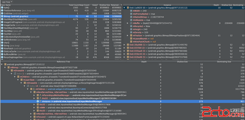 可以和Heap Viewver聯合使用來分總內存洩漏。例如,如果你看見一個位圖對象在堆內存中駐存,你能使用Allocation Tracker查到它的分配地點。