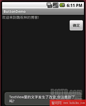 Button按鈕所觸發的事件處理,我們稱之為Event Handle,只不過在android當中,按鈕事件是由系統的Button.OnClickListener所控制,熟悉Java程序設計的讀者對OnXxxListener應該不陌生.以下的Demo,我們將實現當點擊Button時,TextVIEw文字將發生改變,並在屏幕上出現一段時間的Toast提醒.
