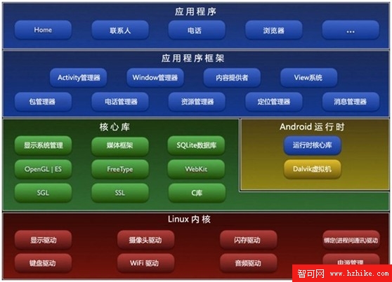 ◆ 核心庫包括,SurfaceManager 顯示系統管理庫,負責把2D或3D內容顯示到屏幕;Media Framework 媒體庫,負責支持圖像,支持多種視頻和音頻的錄制和回放;SQlite 數據庫,一個功能強大的輕量級嵌入式關系數據庫;WebKit 浏覽器引擎等。