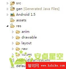 ◆res:資源文件目錄,添加到這個目錄下的文件都會在gen下的R.ava文件中顯示出來;如果res下存放的資源在應用中沒有使用到,那麼在gen下的R.Java的文件中就不會顯示,那麼打包的時候就不會將這部分資源打包,減少了應用的發布文件大小。