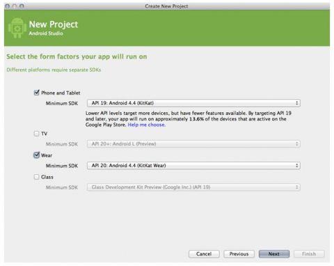 如果要在Android Studio創建一個新項目,點擊文件- >新項目。在向導的第二頁,選擇構成因子,確保選擇Android Wear模塊作為你開發的構成因子(見下圖)。