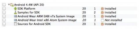 你可以選擇Eclipse或Android Studio作為Android Wear的集成開發環境(IDE)。谷歌建議用Android Studio進行開發。通過Android的SDK管理者下載API 20 (4.4 KitKat Wear):