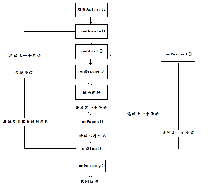 我們知道手游是相當耗費內存的.按照上面的那個流程圖來看..如果其他有優先級的應用需要使用內存空間的時候,並且系統空間並不是很足的時候.就需要殺掉進程.釋放那些已經不再顯示的Activity.也就是處於onStop()狀態的時候.因此當我們如果再次回到那個應用的Activity的界面的時候.就需要重新調用onCreate()方法對Activity進行重新創建.然後再去執行onStart().onResume()。