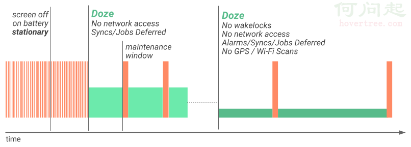 Android N對Android M引進的Doze模式進行了進一步的增強,變化體現在兩個方面.一方面是降低了進入Doze模式的條件,Android M中的條件是不插電,屏幕熄滅且靜置一段時間,在Android N中去掉了靜置的條件,這個改變大大增加了設備進入Doze模式的機會,因而使得Doze對應用程序的影響大大增加.另一方面,Doze模式被分成了兩個階段,當設備切斷電源,熄滅屏幕一段時間,會進入到第一階段,切斷網絡連接,推遲任務和同步.如果設備在第一階段的基礎上再靜置一段時間,就會進入第二階段,在第一階段的基礎上增加對維持喚醒(PowerManager.WakeLock),定時任務(AlarmManager alarms),GPS和Wi-Fi掃描的限制,如下圖所示: