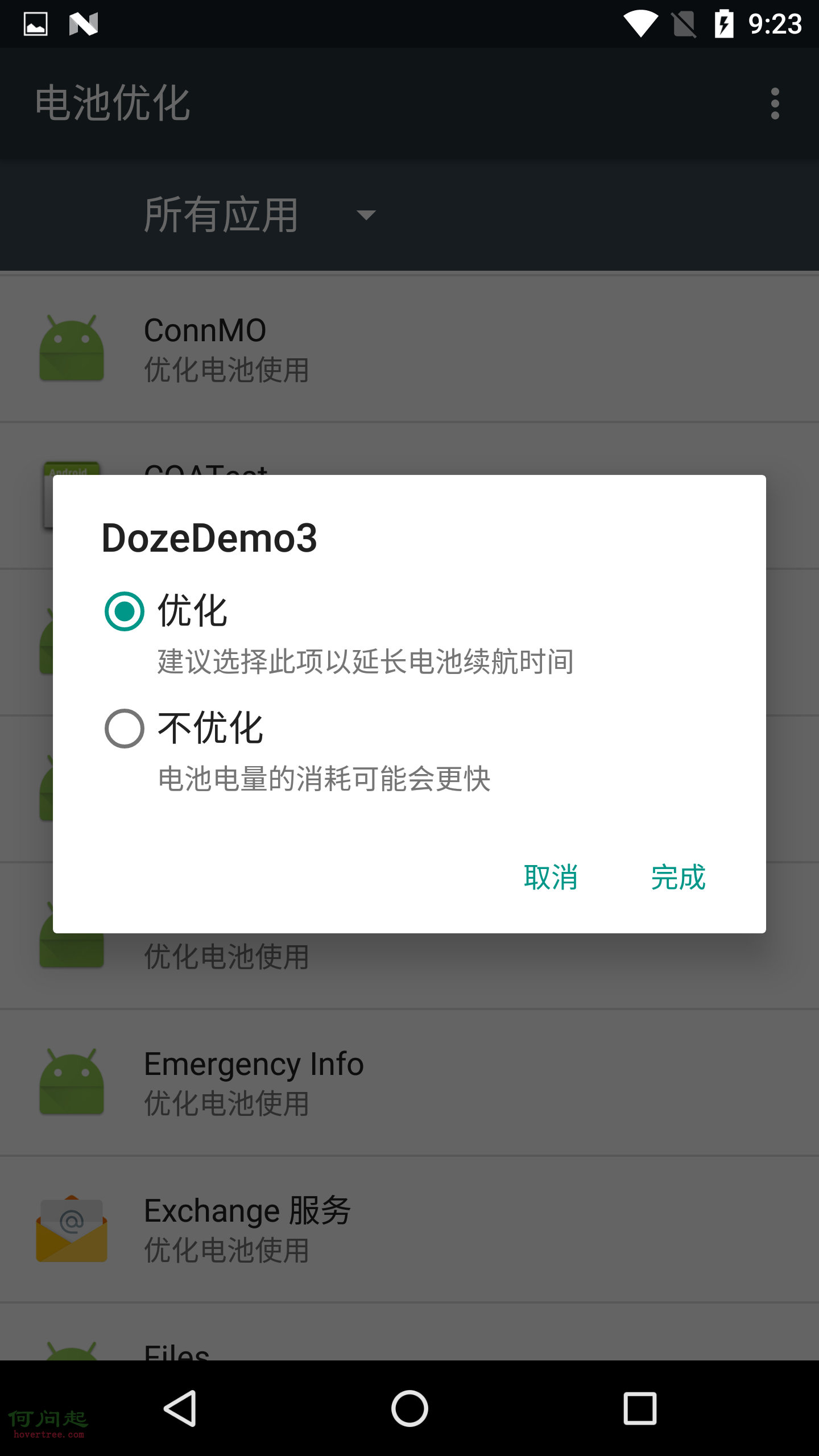 該方法可行,但存在一個缺點:跳轉到電池優化頁後,用戶需要在”所有應用”列表裡(應用安裝後會默認設置為”優化”)找到該應用進行設置,而且系統提示會引導用戶選擇優化,如圖所示: