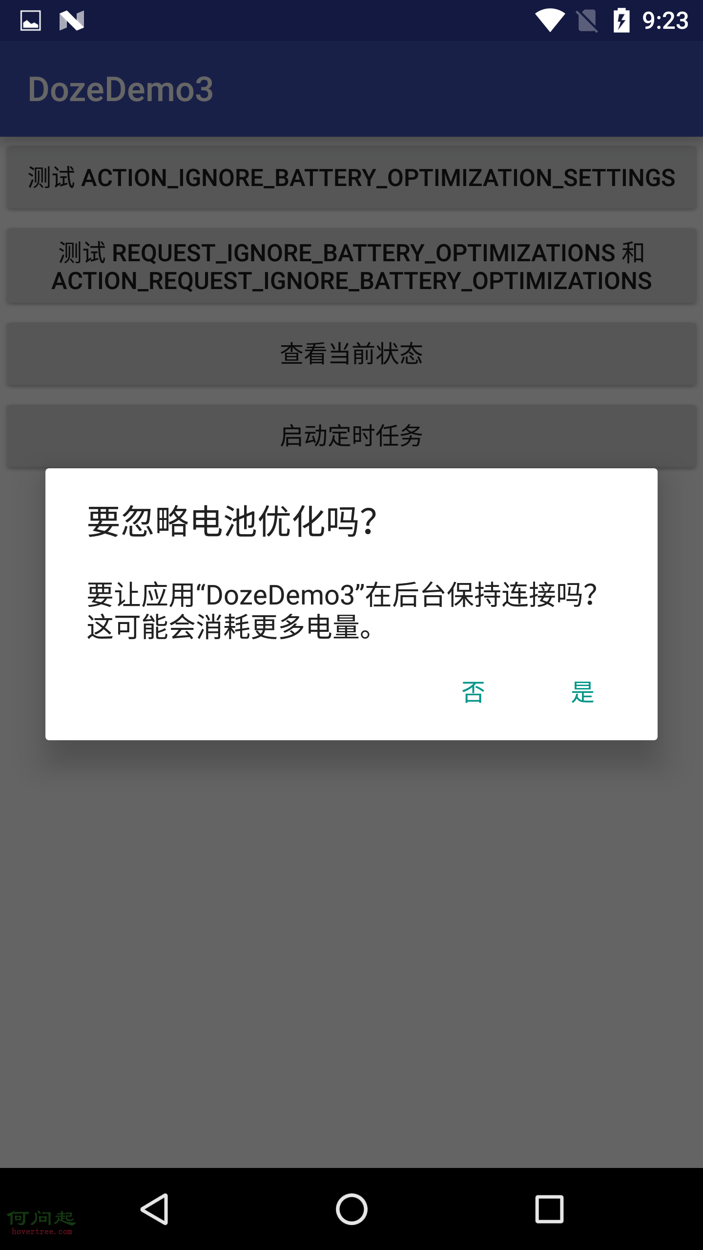 實現方式2(推薦):給應用添加權限REQUEST_IGNORE_BATTERY_OPTIMIZATIONS,並使用ACTION_REQUEST_IGNORE_BATTERY_OPTIMIZATIONS,系統會彈出設置窗口,用戶可以直接將該應用添加到白名單中,如下圖所示: