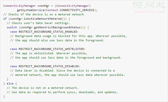 下面的示例代碼來自官方文檔,給出了使用ConnectivityManager.isActiveNetworkMetered()