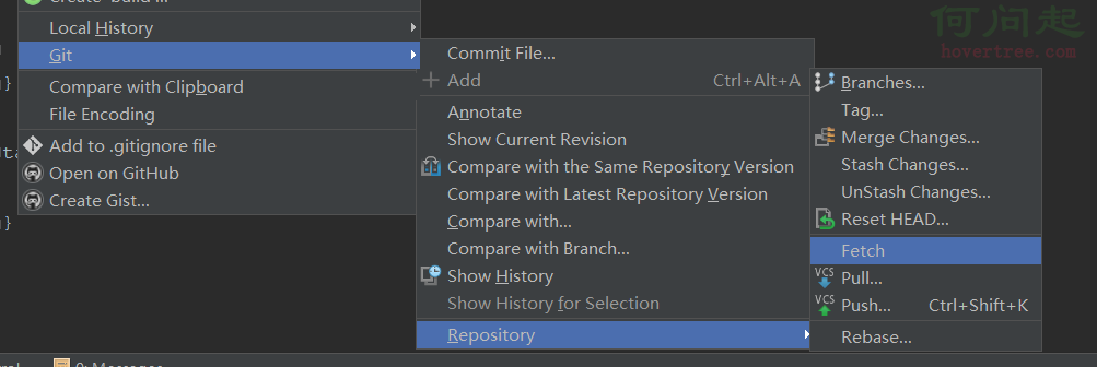 以上是git基本命令,如果你不熟悉,建議先百度學習下git的基本使用。上述命令在git的命令行工具下經常使用,如果不想用命令行也可以使用AS的圖形界面操作,"右鍵"->"git"(如下圖)。裡面有很多git的命令,可以直接點擊使用。