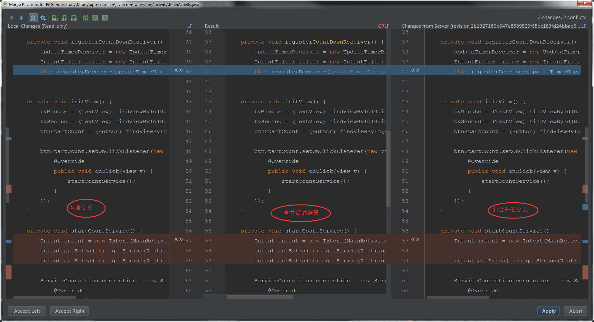 如果出現沖突就會出現下圖,AS提供三種解決方案,"Accept ****"就是字面上的意義,"Merge"是手動解決,AS會提供更直觀的圖形界面,如第二張圖。
