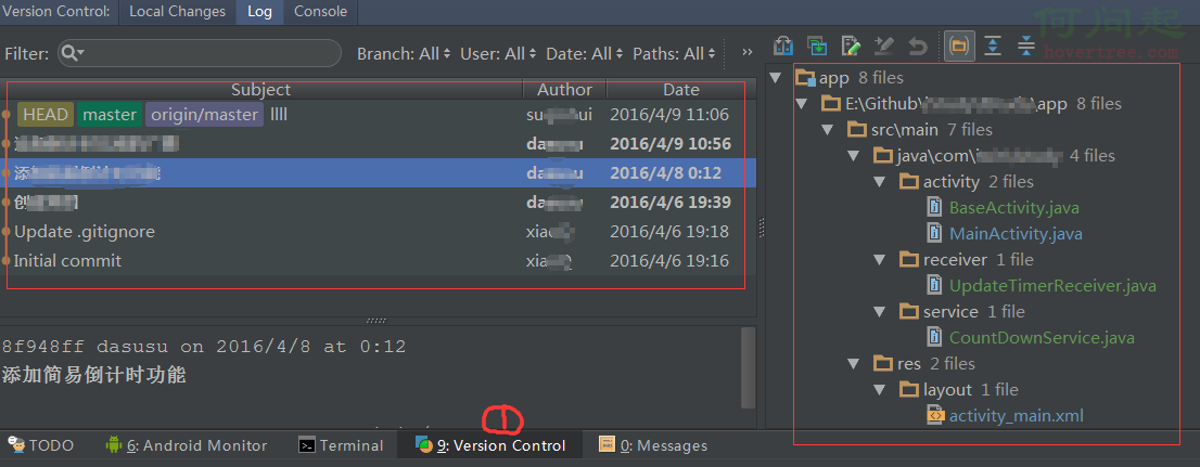 點擊底欄靠左邊的"version control",出現如下圖。其中,左邊表示的是你的倉庫的每一次commit記錄,包括提交信息,提交者以及時間。右邊可以查看任意版本的倉庫對應修改的代碼。這個特別方便,當你想查看某個版本是誰提交的,以及他做了哪些修改,你不必再去登陸github或其他托管倉庫,AS裡就可以查看。