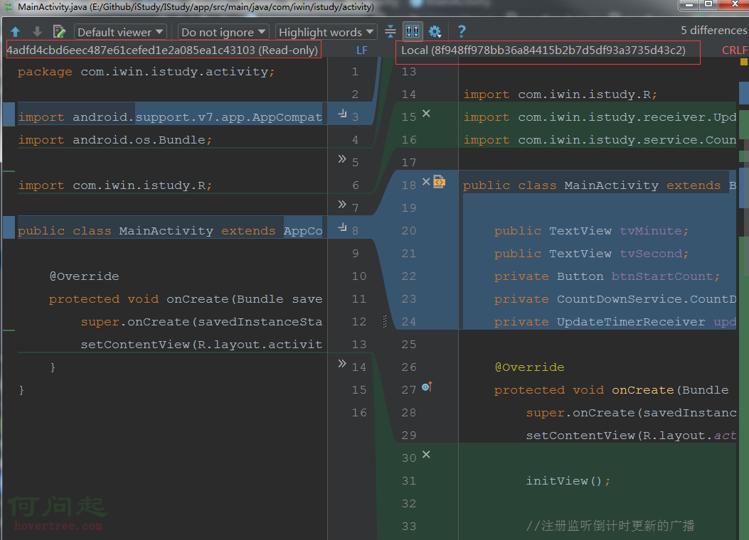 AS提供的圖形界面操作可以讓人很直觀的發現哪些代碼塊起沖突了,這裡就用圖簡單展示下,你可以自己去嘗試下各種沖突,然後實踐下,自己體會是不是會比命令行操作更方便。