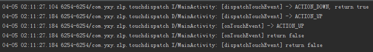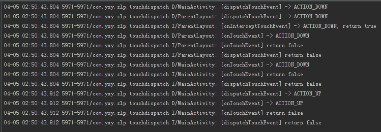 這種情況下,ACTION_DOWN傳到MainActivity的dispatchTouchEvent方法時,直接返回了true(被丟棄),因此沒有找到TargetView,則後續的ACITON_MOVE、ACTION_UP會直接交由MainActivity的onTouchEvent處理,而它的onTouchEvent默認會返回false(沒有能力消耗觸摸事件)。我們來看一下日志輸出: