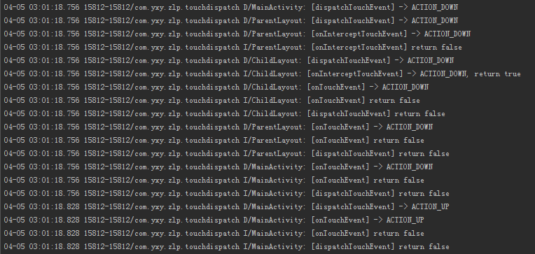 這種情況下,ACTION_DOWN分發到ParentLayout時被攔截,則會交給ParentLayout的onTouchEvent處理,而由於未找到TargetView,後續的ACTION_MOVE、ACTION_DOWN事件便無從下發,在MainActivity層就會停止下發。注意到onInterceptTouchEvent方法與dispatchTouchEvent方法的區別,前者若對ACTION_DOWN返回true,則同一事件序列的後續事件便在MainActivity層終止下發;後者若對ACTION_DOWN返回true,後續ACTION_MOVE及ACTION_UP會在返回true的那層終止下發,且回傳時只有返回true的那層以及MainActivity層的onTouchEvent方法會被回掉。日志輸出如下: