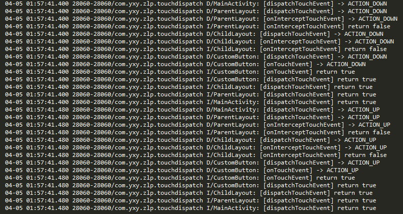 在本例中,觸摸事件分發響應的正常情況就是CustomButton消耗了觸摸事件,然後層層向上返回true,最後到了MainAcitivity那便知道這次觸摸事件被成功消耗了。這就好比老總下發任務,經過各級經理下發到員工後,員工圓滿完成了任務,然後逐級上報最後匯報給了老總。我們來看一下日志輸出: