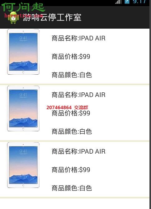 <?xml version="1.0" encoding="utf-8"?> <TableLayout xmlns:android="http://schemas.android.com/apk/res/android" android:layout_width="match_parent" android:layout_height="match_parent" > <TableRow android:id="@+id/tableRow1" android:layout_width="fill_parent" android:layout_height="wrap_content" > <TableLayout android:layout_width="match_parent" android:layout_height="match_parent" > <TableRow android:layout_width="fill_parent" android:layout_height="wrap_content" > <ImageView android:layout_width="100dp" android:layout_height="100dp" android:src="@raw/pad" /> </TableRow> </TableLayout> <TableLayout android:layout_width="match_parent" android:layout_height="match_parent" > <TableRow android:layout_width="fill_parent" android:layout_height="wrap_content" > <TableLayout android:layout_width="match_parent" android:layout_height="fill_parent" > <TableRow android:layout_height="match_parent" > <TextView android:layout_width="wrap_content" android:layout_height="wrap_content" android:text="商品名稱:IPAD AIR" android:layout_margin="10dp" /> </TableRow> <TableRow android:layout_height="match_parent" > <TextView android:layout_width="wrap_content" android:layout_height="wrap_content" android:text="商品價格:$99" android:layout_margin="10dp" /> </TableRow> <TableRow android:layout_height="match_parent" > <TextView android:layout_width="wrap_content" android:layout_height="wrap_content" android:text="商品顏色:白色" android:layout_margin="10dp" /> </TableRow> </TableLayout> </TableRow> </TableLayout> </TableRow> <TableRow android:id="@+id/tableRow2" android:layout_width="fill_parent" android:layout_height="5dp" android:background="#EEE8CD" > <TextView android:layout_width="fill_parent" android:layout_height="3dp" android:background="#EEE8CD" /> </TableRow> <TableRow android:id="@+id/tableRow1" android:layout_width="fill_parent" android:layout_height="wrap_content" > <TableLayout android:layout_width="match_parent" android:layout_height="match_parent" > <TableRow android:layout_width="fill_parent" android:layout_height="wrap_content" > <ImageView android:layout_width="100dp" android:layout_height="100dp" android:src="@raw/pad" /> </TableRow> </TableLayout> <TableLayout android:layout_width="match_parent" android:layout_height="match_parent" > <TableRow android:layout_width="fill_parent" android:layout_height="wrap_content" > <TableLayout android:layout_width="match_parent" android:layout_height="fill_parent" > <TableRow android:layout_height="match_parent" > <TextView android:layout_width="wrap_content" android:layout_height="wrap_content" android:text="商品名稱:IPAD AIR" android:layout_margin="10dp" /> </TableRow> <TableRow android:layout_height="match_parent" > <TextView android:layout_width="wrap_content" android:layout_height="wrap_content" android:text="商品價格:$99" android:layout_margin="10dp" /> </TableRow> <TableRow android:layout_height="match_parent" > <TextView android:layout_width="wrap_content" android:layout_height="wrap_content" android:text="商品顏色:白色" android:layout_margin="10dp" /> </TableRow> </TableLayout> </TableRow> </TableLayout> </TableRow> <TableRow android:id="@+id/tableRow2" android:layout_width="fill_parent" android:layout_height="5dp" android:background="#EEE8CD" > <TextView android:layout_width="fill_parent" android:layout_height="3dp" android:background="#EEE8CD" /> </TableRow> <TableRow android:id="@+id/tableRow1" android:layout_width="fill_parent" android:layout_height="wrap_content" > <TableLayout android:layout_width="match_parent" android:layout_height="match_parent" > <TableRow android:layout_width="fill_parent" android:layout_height="wrap_content" > <ImageView android:layout_width="100dp" android:layout_height="100dp" android:src="@raw/pad" /> </TableRow> </TableLayout> <TableLayout android:layout_width="match_parent" android:layout_height="match_parent" > <TableRow android:layout_width="fill_parent" android:layout_height="wrap_content" > <TableLayout android:layout_width="match_parent" android:layout_height="fill_parent" > <TableRow android:layout_height="match_parent" > <TextView android:layout_width="wrap_content" android:layout_height="wrap_content" android:text="商品名稱:IPAD AIR" android:layout_margin="10dp" /> </TableRow> <TableRow android:layout_height="match_parent" > <TextView android:layout_width="wrap_content" android:layout_height="wrap_content" android:text="商品價格:$99" android:layout_margin="10dp" /> </TableRow> <TableRow android:layout_height="match_parent" > <TextView android:layout_width="wrap_content" android:layout_height="wrap_content" android:text="商品顏色:白色" android:layout_margin="10dp" /> </TableRow> </TableLayout> </TableRow> </TableLayout> </TableRow> <TableRow android:id="@+id/tableRow2" android:layout_width="fill_parent" android:layout_height="5dp" android:background="#EEE8CD" > <TextView android:layout_width="fill_parent" android:layout_height="3dp" android:background="#EEE8CD" /> </TableRow> </TableLayout>