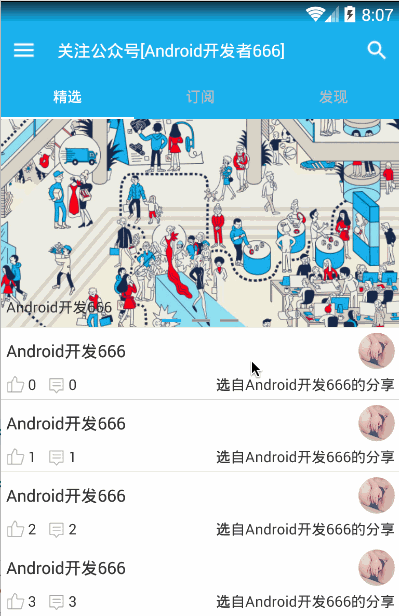 從gif動態效果圖中我們可以看出,最外層有三個tab(精選,訂閱,發現),在精選界面頂部有一個輪播的圖片廣告,廣告下面是一個精選文章列表。