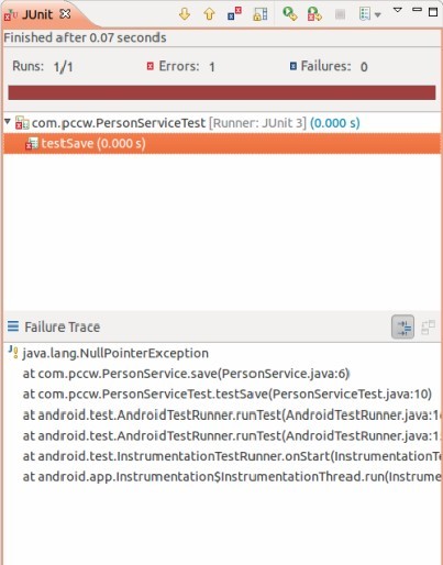 然後想要測試哪個方法,則在哪個測試方法上右鍵鼠標,選擇Run As,然後再選擇Android JUnit Test即可,如果有異常或者錯誤,則會出現如下情況: