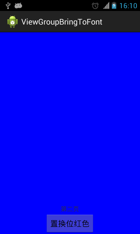 <RelativeLayout xmlns:android="http://schemas.android.com/apk/res/android" xmlns:tools="http://schemas.android.com/tools" android:layout_width="match_parent" android:layout_height="match_parent" > <RelativeLayout android:id="@+id/red" android:layout_width="match_parent" android:layout_height="match_parent" android:background="#ff0000" > <TextView android:layout_width="wrap_content" android:layout_height="wrap_content" android:layout_above="@+id/switch2blue" android:layout_centerHorizontal="true" android:text="首頁" /> <Button android:id="@+id/switch2blue" android:layout_width="wrap_content" android:layout_height="wrap_content" android:layout_centerInParent="true" android:text="置換位藍色" /> </RelativeLayout> <RelativeLayout android:id="@+id/blue" android:layout_width="match_parent" android:layout_height="match_parent" android:background="#0000ff" > <TextView android:layout_width="wrap_content" android:layout_height="wrap_content" android:layout_above="@+id/switch2red" android:layout_centerHorizontal="true" android:text="第二頁" /> <Button android:id="@+id/switch2red" android:layout_width="wrap_content" android:layout_height="wrap_content" android:layout_alignParentBottom="true" android:layout_centerHorizontal="true" android:text="置換位紅色" /> </RelativeLayout> </RelativeLayout>