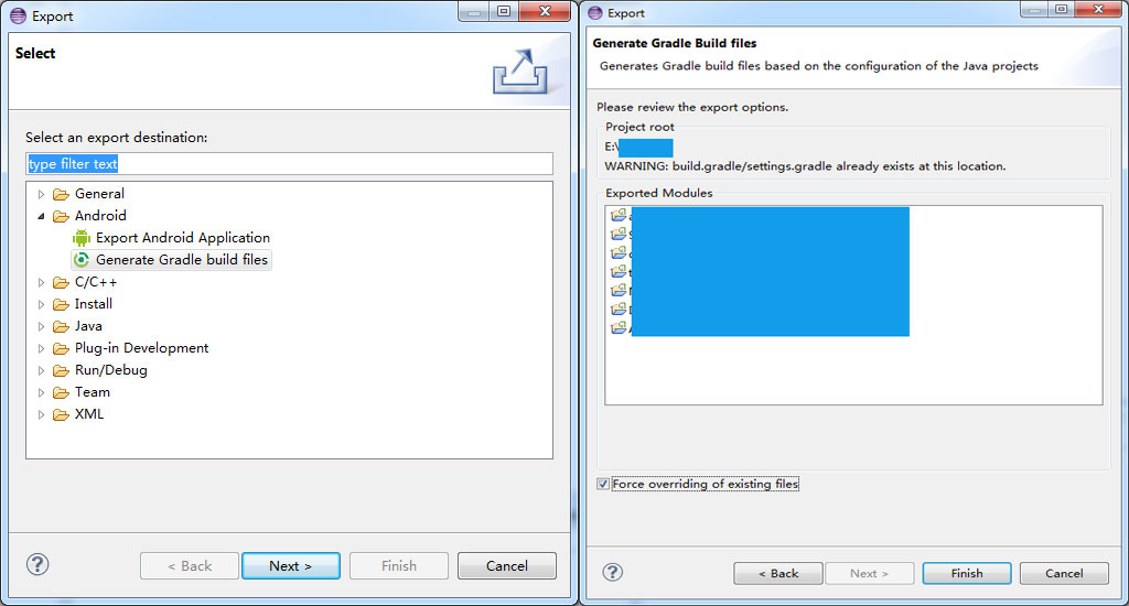File->Export->Generate Gradle build files然後一直下一步,選擇你要導出的項目(不用管依賴項目,會自動導出的),如圖: