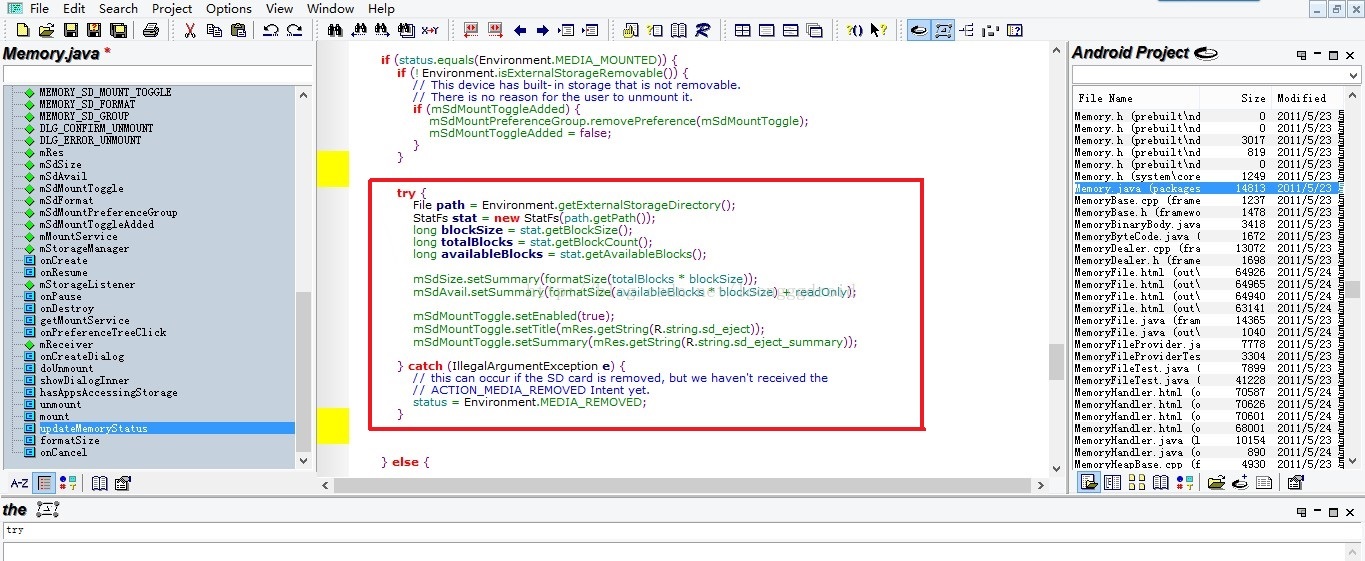 可能有的同學不知道系統已經提供了獲取獲取SD卡總容量,可用大小,機身內存總容量及可用大小的系統方法,用系統源代碼提供的方法可以很簡單,方便的獲取其大小。這裡我把系統源代碼中的一個方法貼出來,供大家參考一下: