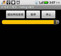 <?xml version="1.0" encoding="utf-8"?> <FrameLayout xmlns:android="http://schemas.android.com/apk/res/android" android:layout_height="fill_parent" android:layout_width="fill_parent"> <LinearLayout android:layout_height="wrap_content" android:layout_width="fill_parent" android:orientation="vertical" android:layout_gravity="top"> <LinearLayout android:orientation="horizontal" android:layout_gravity="center_horizontal" android:layout_marginTop="4.0dip" android:layout_height="wrap_content" android:layout_width="wrap_content"> <Button android:layout_width="wrap_content" android:layout_height="wrap_content" android:id="@+id/btnPlayUrl" android:text="播放網絡音頻"></Button> <Button android:layout_height="wrap_content" android:id="@+id/btnPause" android:text="暫停" android:layout_width="80dip"></Button> <Button android:layout_height="wrap_content" android:layout_width="80dip" android:text="停止" android:id="@+id/btnStop"></Button> </LinearLayout> <LinearLayout android:orientation="horizontal" android:layout_width="fill_parent" android:layout_height="wrap_content" android:layout_marginBottom="20dip"> <SeekBar android:paddingRight="10dip" android:layout_gravity="center_vertical" android:paddingLeft="10dip" android:layout_weight="1.0" android:layout_height="wrap_content" android:layout_width="wrap_content" android:id="@+id/skbProgress" android:max="100"></SeekBar> </LinearLayout> </LinearLayout> </FrameLayout>