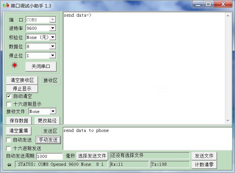 接下來貼出本文運行的結果,首先是連接BLE設備後,枚舉出設備所有Service、Characteristic、Descriptor,並且手機會往Characteristic uuid=0000ffe1-0000-1000-8000-00805f9b34fb寫入“send data->”字符串,BLE終端收到數據通過串口傳到PC串口助手: