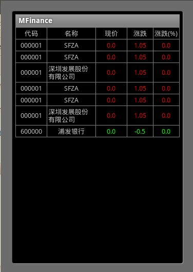 在這裡我們要使用Android ListView來實現顯示股票行情,效果圖如下,紅色表示股票價格上漲,綠色表示股票價格下跌。