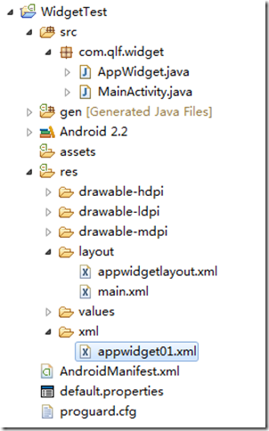 這個xml是用來描述你所要創建的appWidget的一些描述信息的,比如高度、寬度、刷新間隔、布局文件等等。僅僅這個描述文件還不夠,我們看到的appWidget可都是有界面元素的呀,比如說文本,圖片,按鈕等等,這些東西的定義都需要放到layout文件夾下面。這個文件就是上面代碼中寫到的那個appwidgetlayout。