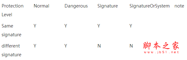 另外我曾經在Android Permission權限機制引子提到過Protection Level問題,這邊我同樣測試下這個Protection Level,下面結果中Y表示可以正常訪問,N則表示不可以訪問。