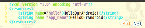 這時我們可以看到在當前目錄下已經生成HelloOurAndroid/文件夾了,我們來查看下反編譯後的AndroidManifest.xml文件和strings.xml文件: