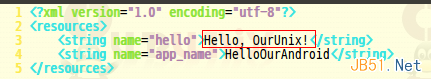 重打包剛剛修改過的HelloOurAndroid.apk,我們就修改strings.xml目錄下的“hello”為:Hello,OurUnix!