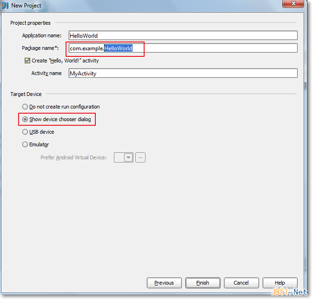 Package name已經開始推薦大小寫混合(之前是不推薦大寫字母的,估計是Android應用越來越多,只用小寫字母標志Package name已經不夠了)。Package name中如果出現主域部分出現example,則不予提交到Google Play應用市場,所以如果你有打算把應用提交到應用市場的計劃,就把example給換掉。同時Target device選擇 Show device chooser dialog