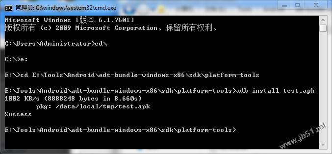 將發布好的apk文件移至android的sdk路徑中的platform-tools文件夾中,然後打開cmd控制台,先進入到android的sdk路徑中的platform-tools路徑中,命令是“cd +具體路徑”,我的是“cd E:\Tools\Android\adt-bundle-windows-x86\sdk\platform-tools”,然後回車;