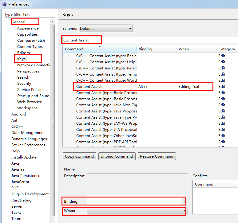 3.依次打開eclipse上面的windows ——preferences ——General —— Keys, 在Scheme的下面有一個搜索框,在搜索框裡面輸入“Content asist”,選中“Content asist”這一項後,將Binding項改為“ALT+/”將When項選擇成Editing Text即可;