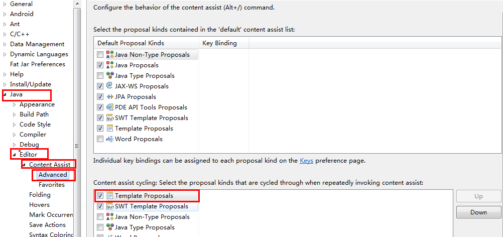 4.依次打開windows ——preferences ——java ——editor —— content assist —— advanced,選中右下方復選框的Template Proposals一項即可。